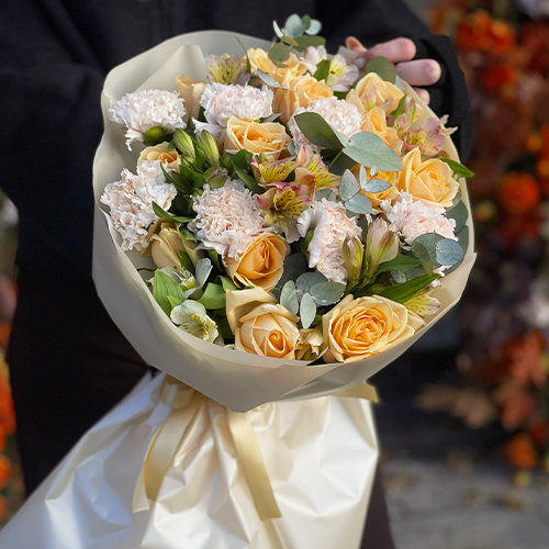 Букет "Пломбирный" из роз Аваланж, диантусов, альстромерий и эвкалипта