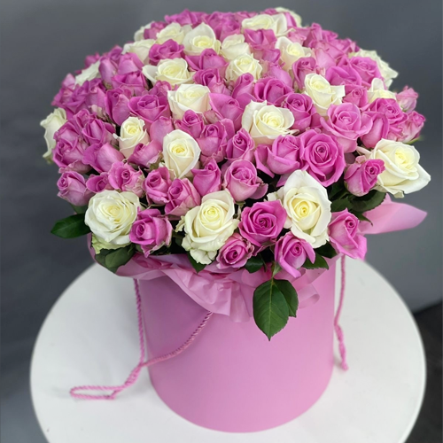 Композиция в шляпной коробке из 151 розы кения микс